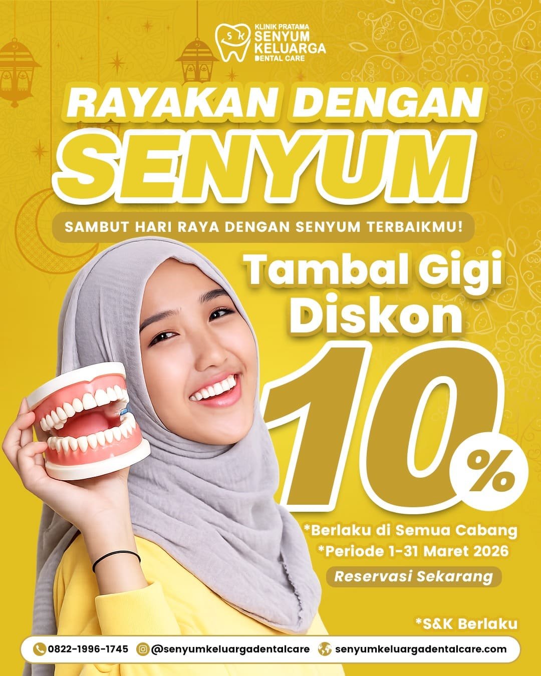Rayakan momen Hari Raya dengan senyum sehat dan percaya diri bersama promo spesial dari Senyum Keluarga Dental Care! Nikmati diskon 10% untuk perawatan tambal gigi yang berlaku di semua cabang selama periode 1–31 Maret 2026.