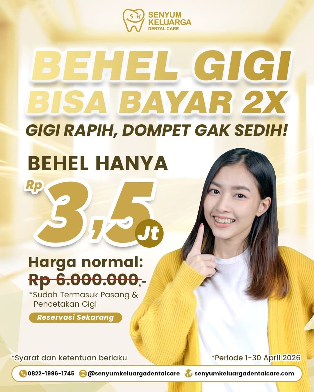 Saatnya punya senyum rapi tanpa bikin kantong panik! Pasang behel sekarang, bisa bayar 2x lebih ringan, lebih nyaman! Promo spesial cuma Rp 3,5 Jt, sudah termasuk pasang & pencetakan gigi. Yuk, upgrade senyum kamu mulai hari ini!