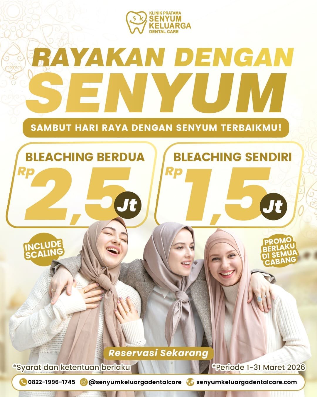 Sambut Hari Raya dengan senyum terbaikmu bersama promo spesial dari Senyum Keluarga Dental Care! Nikmati paket bleaching sendiri hanya Rp 1,5 juta atau bleaching berdua Rp 2,5 juta, sudah termasuk scaling.